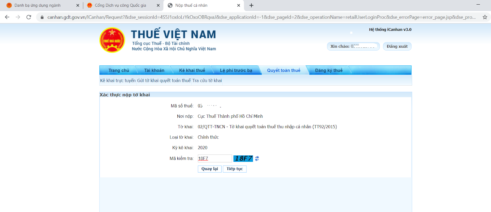 Sau khi hệ thống hiển thị cơ quan thuế quản lý quyết toán, bạn chỉ cần kiểm tra và nhấn “Tiếp tục” để sang bước tiếp theo.
