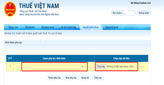 Tiếp theo, chọn “Thêm mới phụ lục” để tải lên các hồ sơ liên quan như: chứng từ khấu trừ thuế, hợp đồng, CCCD, và các chứng từ khác (nếu có). Đây là bước quan trọng để hồ sơ rõ ràng và hạn chế bị yêu cầu bổ sung.