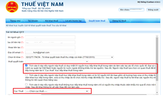 → Bạn chọn cơ quan thuế (Cục Thuế) nơi bạn đã khai trực tiếp trong năm tại ô “Cục thuế”.