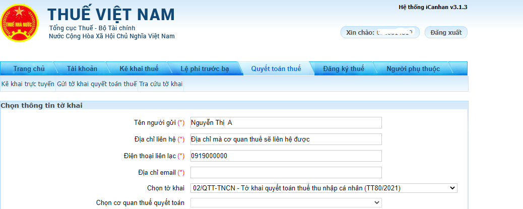 Sau khi chọn cơ quan thuế, bạn tiếp tục điền các mục quan trọng: