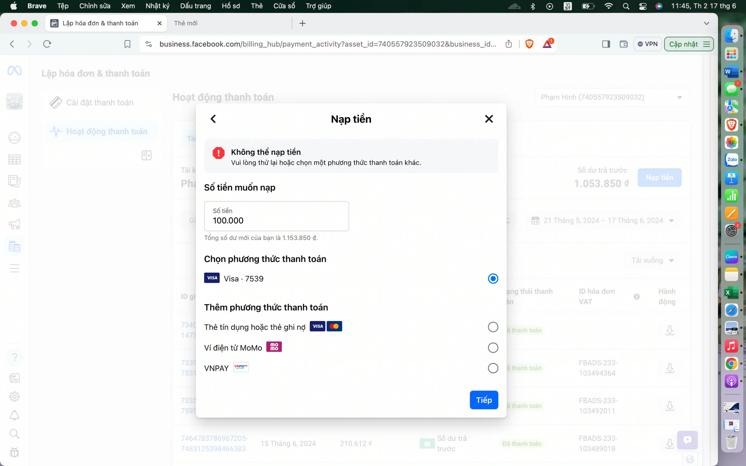 Bên cạnh nội dung và hình ảnh, vấn đề thanh toán cũng là một trong những nguyên nhân phổ biến khiến quảng cáo Facebook bị từ chối. Việc Facebook không thể trừ tiền hoặc xác minh giao dịch hợp lệ sẽ khiến chiến dịch của bạn bị tạm dừng, thậm chí khóa tài khoản quảng cáo. Dưới đây là những lỗi thường gặp khi sử dụng thẻ thanh toán và cách khắc phục để giúp bạn duy trì hoạt động quảng cáo ổn định.