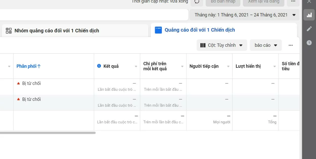 - Chọn tài khoản quảng cáo có quảng cáo bị từ chối.