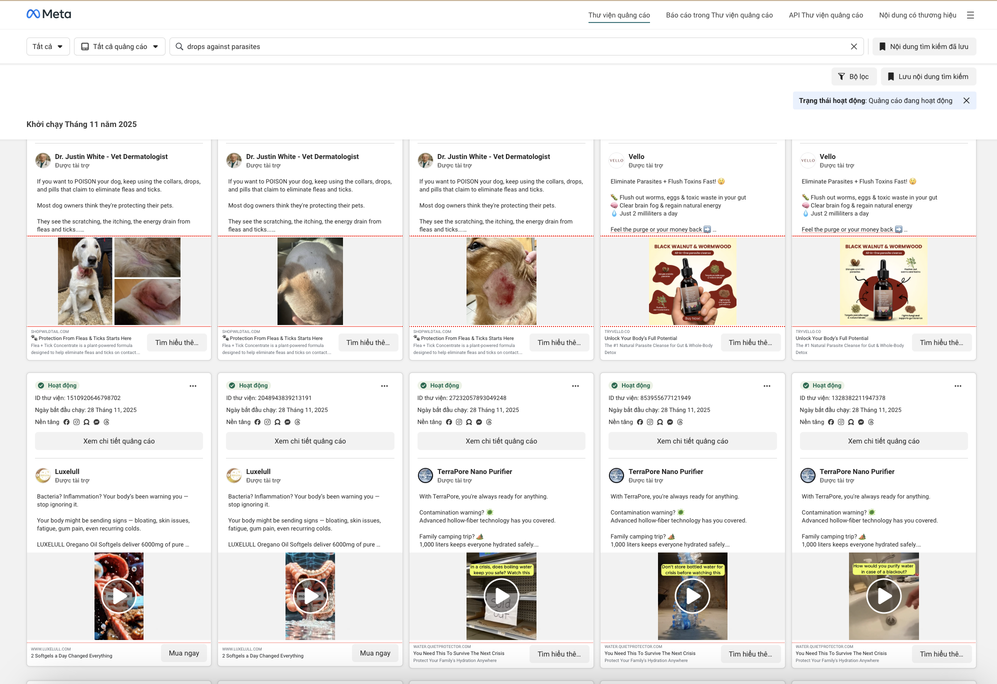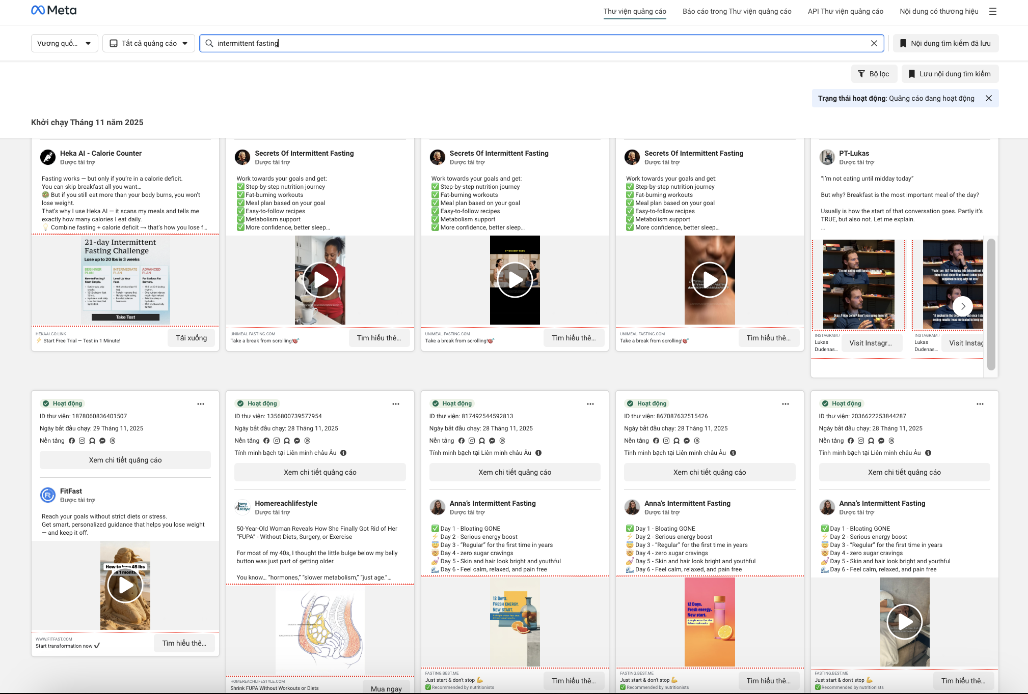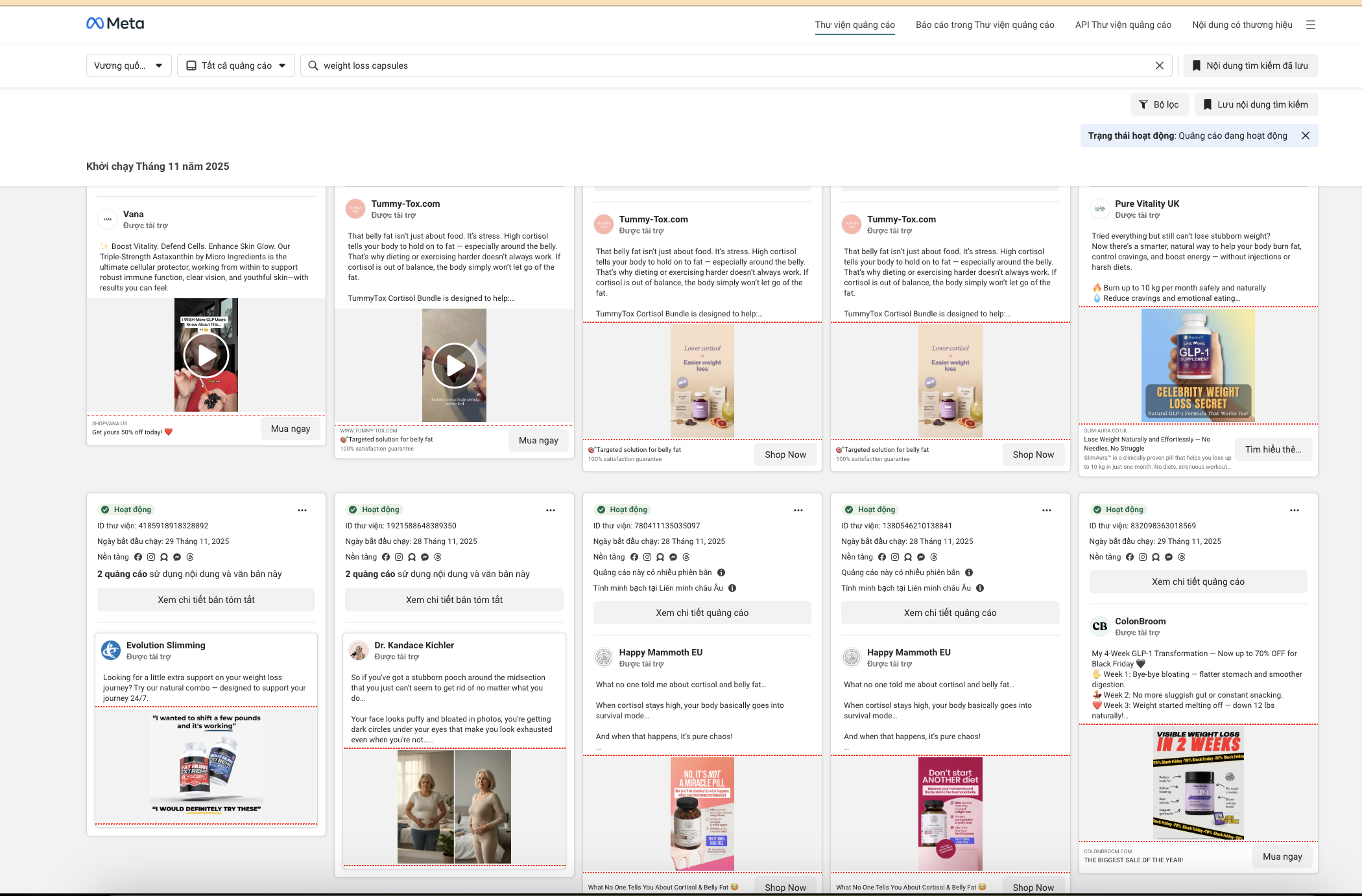 Tổng cộng cũng có khoảng 50 từ khóa dạng “liên quan” như vậy. Và để kiểm chứng, mình đã thử toàn bộ trong Ads Library để xem liệu có ra được quảng cáo Nutra hay không. Kết quả khá bất ngờ: một vài từ khóa đã giúp tìm đúng creative cần thiết, chẳng hạn: