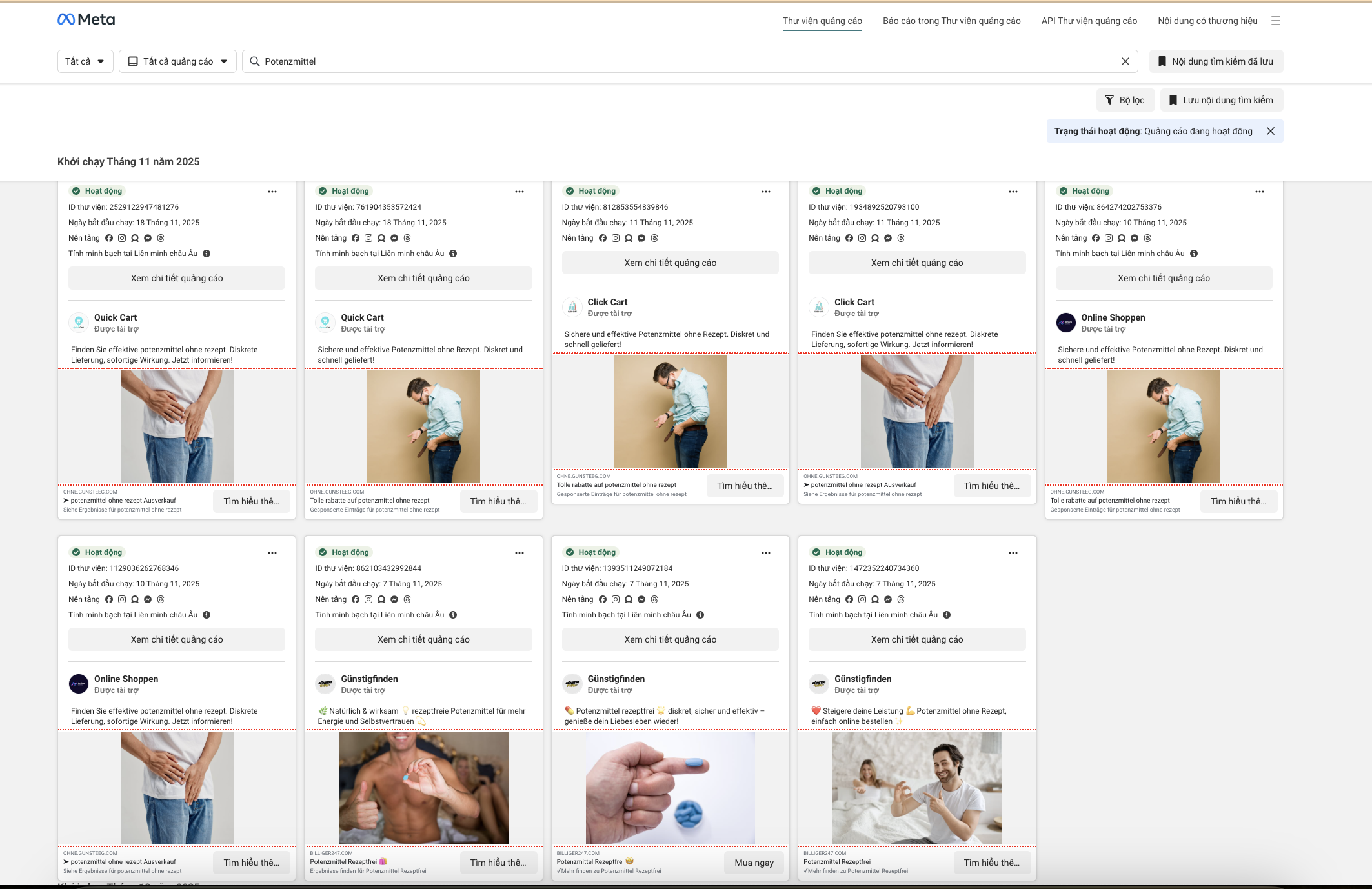Các từ khóa này khi tìm trên Facebook Ads Library thường hiển thị rất nhiều quảng cáo theo các angle quen thuộc: cải thiện chức năng sinh lý, tăng ham muốn, kéo dài thời gian, công thức thảo dược châu Âu, hoặc creative dạng review từ “người dùng thật”.