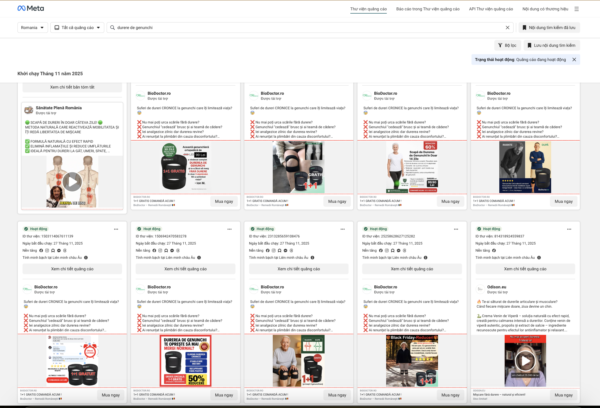 Tiếp theo, chúng ta sẽ thử tìm creative cho các offer về xương khớp bằng cách sử dụng bộ từ khóa do ChatGPT gợi ý. Để minh họa rõ hơn, phần ví dụ dưới đây sẽ dùng từ khóa tiếng Romania, vì đây cũng là một GEO mà Facebook Ads Library trả về dữ liệu khá đầy đủ.