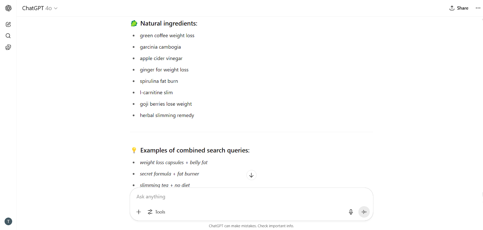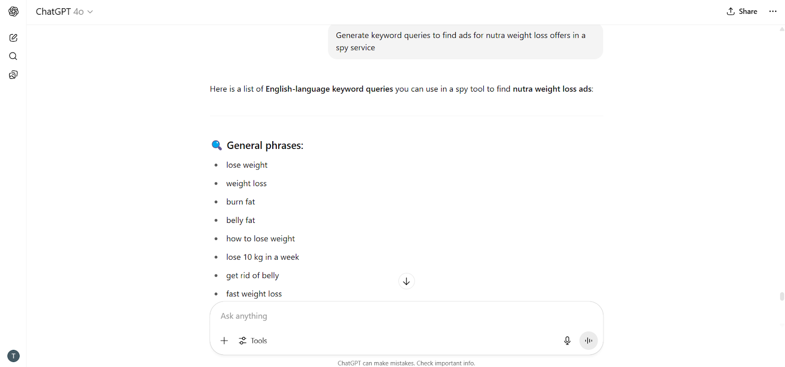 - Một cách đơn giản để tạo bộ từ khóa đúng và đủ là sử dụng ChatGPT mô hình AI hiểu rõ về Nutra và có thể tạo ra danh sách keyword được tối ưu riêng cho Ads Library.