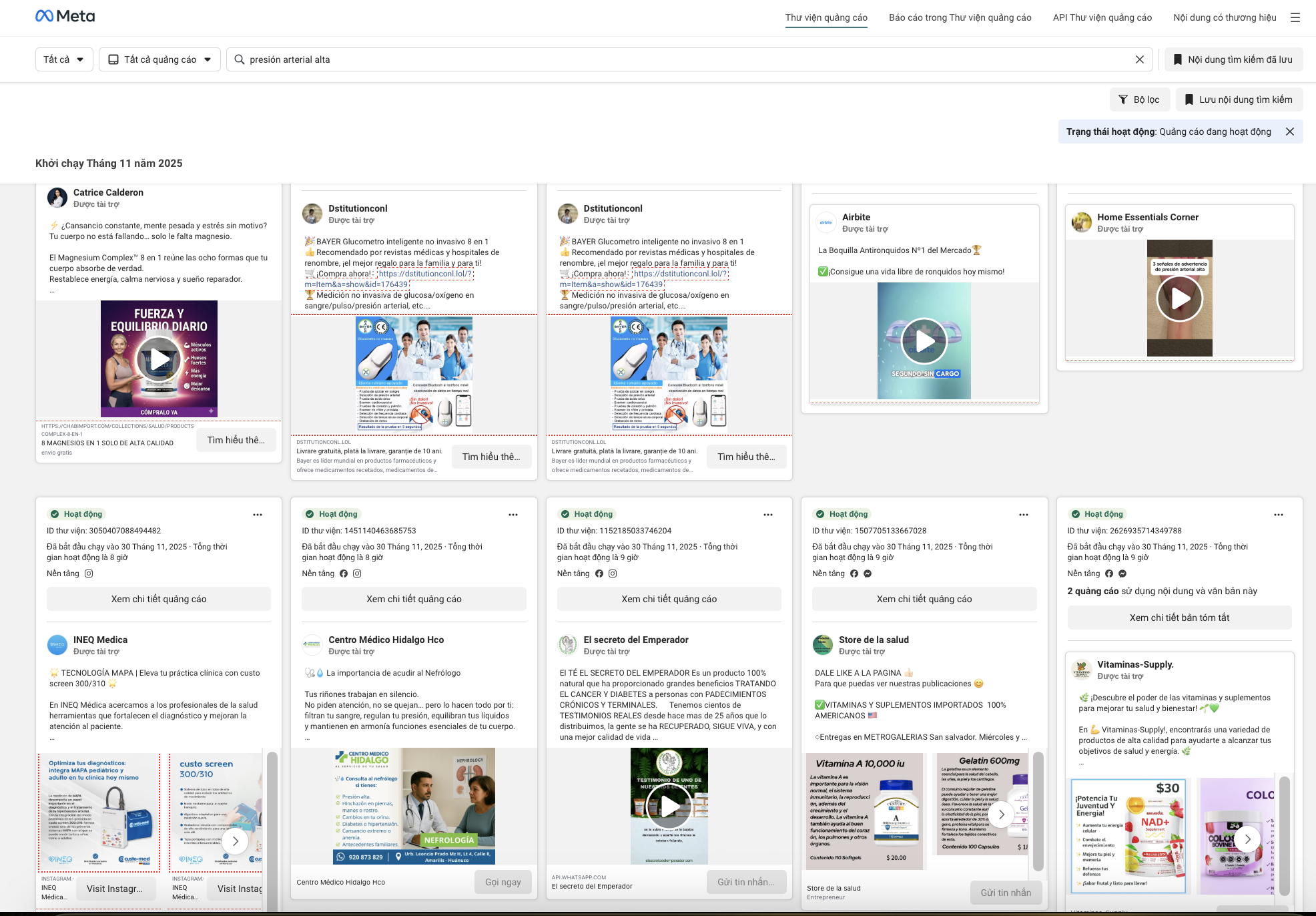 Những từ khóa này cho ra rất nhiều quảng cáo đúng nhóm Nutra huyết áp: từ caps, thuốc thảo dược, serum hỗ trợ tuần hoàn, cho đến các quảng cáo theo angle “bác sĩ khuyến nghị” hoặc “nguyên liệu thiên nhiên hỗ trợ ổn định huyết áp”.