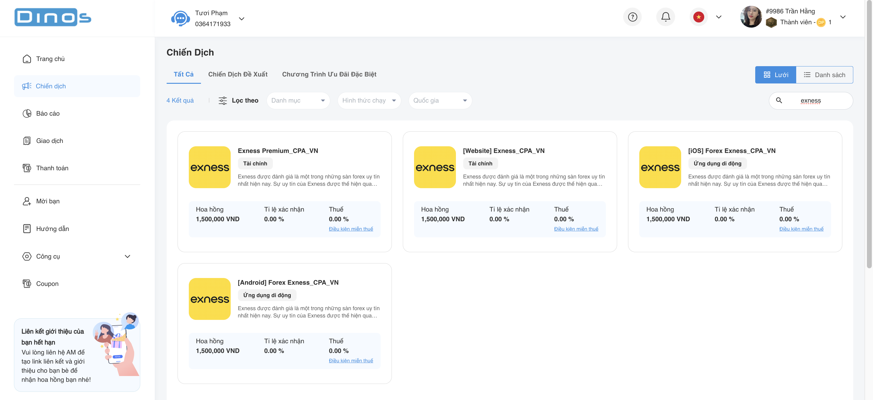 Hiện tại, Dinos Việt Nam đang hợp tác cùng Exness triển khai chương trình tiếp thị liên kết dành cho Publisher, với hoa hồng siêu HOT lên đến ~40$( 24.000.000 VNĐ).